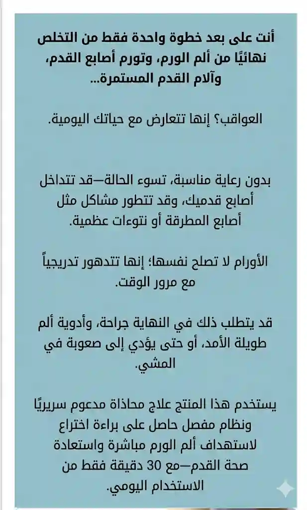 النتائج المتوقعة: تلاشي الألم خلال 7 أيام، وتحسن ملحوظ في استقامة الإصبع خلال 30 يوماً، ومع الوقت ستستعيد عضلاتك قوتها لتعود قدمك لشكلها الطبيعي.